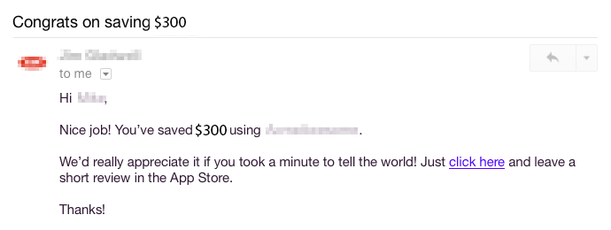 Have you ever gotten emails asking for reviews that come days or weeks after you’ve last had any interaction with them? By doing so, you are forcing the customers to do the hard work of recalling the details of their interactions, long after it happened. The best time to ask for a review is when the value that you’ve delivered is at the top of their minds. For instance, when customers have positive communication with your brand, when they hit a usage milestone (value of their purchases or time they spend), or when you send your receipt and reinforce the value of doing business with you.