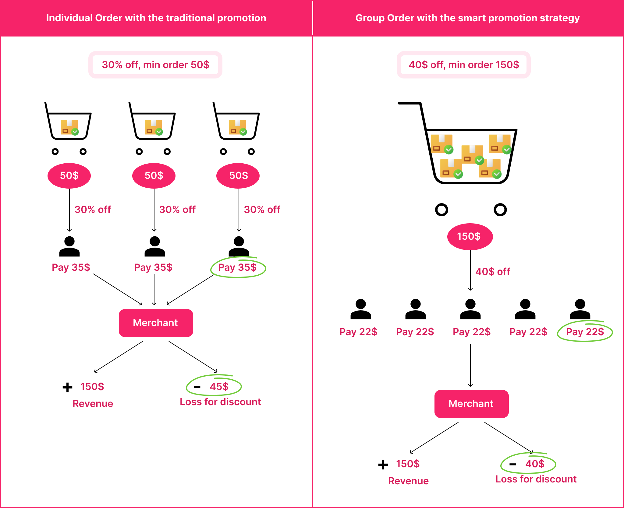 Your competitors offer a discount of 30% for an order with min value of $50. Suppose there are three consumers and each one spends $50, they will get 150$ in revenue and lose 45$ for the discount. Whereas, you offer group order experience with the smart discount strategy, 40$ off for an order with min value of 150$. Suppose there are 5 people involved in a cart and their total spending is 150$, you will get the same amount of revenue, while just losing 40$ for a discount.
