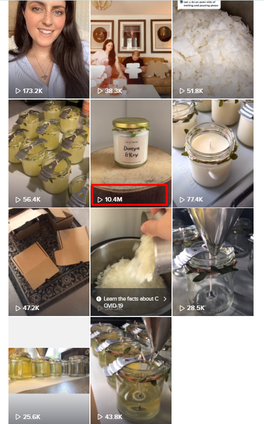 The newly-wed couple’s business started out of the wife’s hobby with handmade candles and soap. She made them for their wedding and went on to tell the business story that way. The view count was decent. Fluctuating around 100k at first until it soared to 10M views in a video when she just casually, authentically talks about how the candles are made.