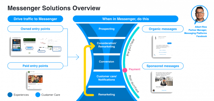 First of all, you need to understand what customer funnel on Messenger by a chart from Albert Rios, Facebook Messenger Partner Manager, speaking on Facebook Messenger marketing.