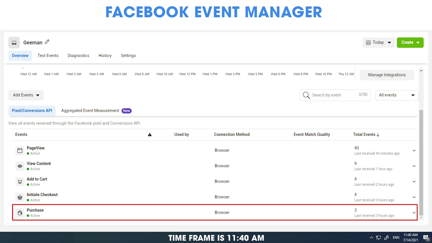 However, the Facebook Event Manager still does not show the real-time purchase at the time event is recorded.