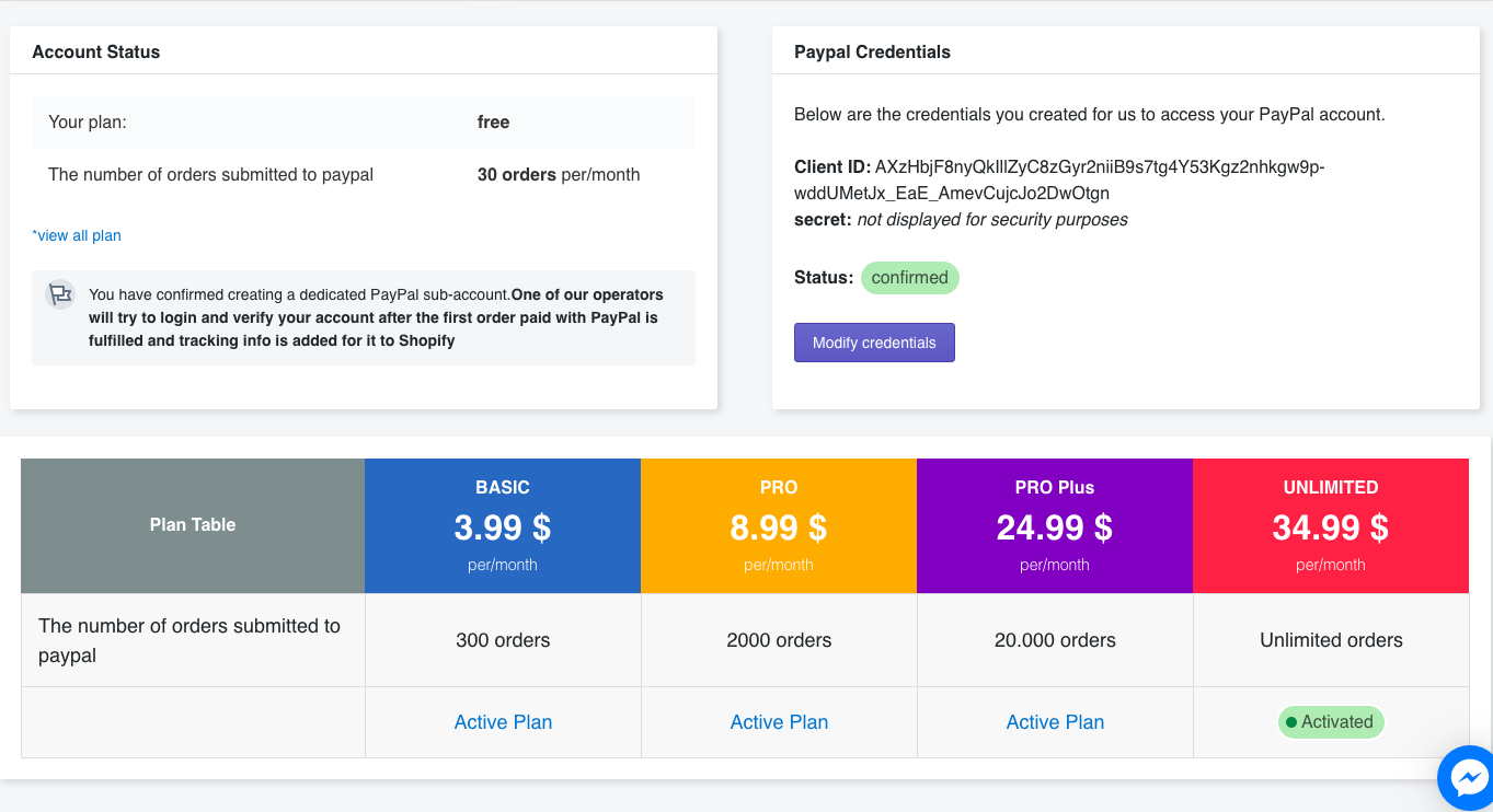 Except for the UNLIMITED plan, the other three have a limited number of orders available for submission to PayPal. For each plan, we submit tracking information to PayPal for one order.