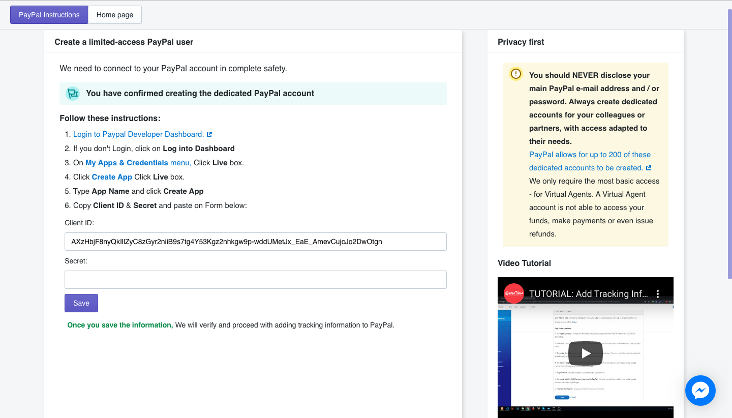 The Client ID & Secret provide us the minimal permissions to access your account in order to add tracking code to PayPal.