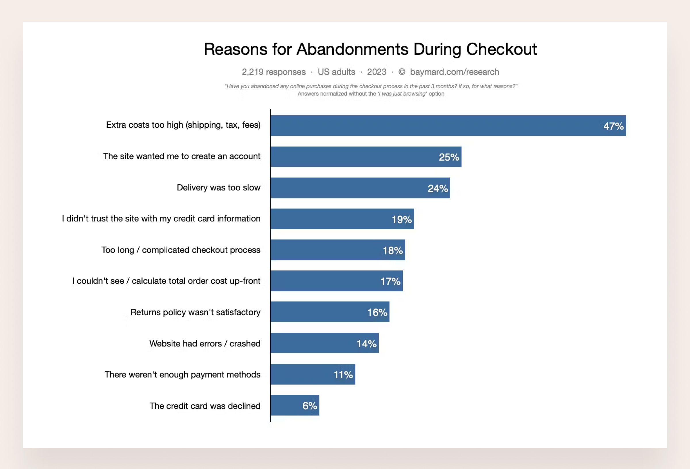 One of the primary reasons customers abandon their cart is the long and complicated checkout process. According to some surveys, 18% of US customers and 33% of European consumers leave their cart for this reason.