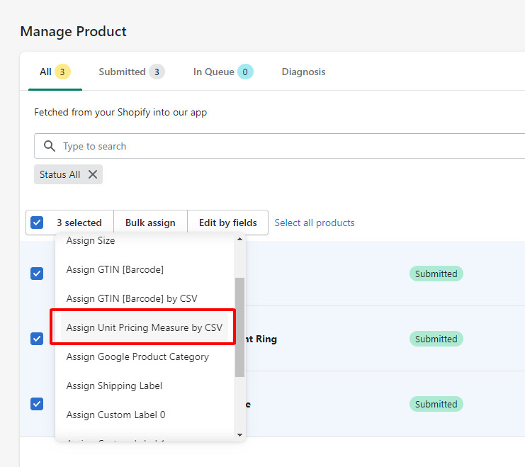 Step 1: Choose products that you want to bulk assign unit price then select the Assign unit pricing measure by CSV