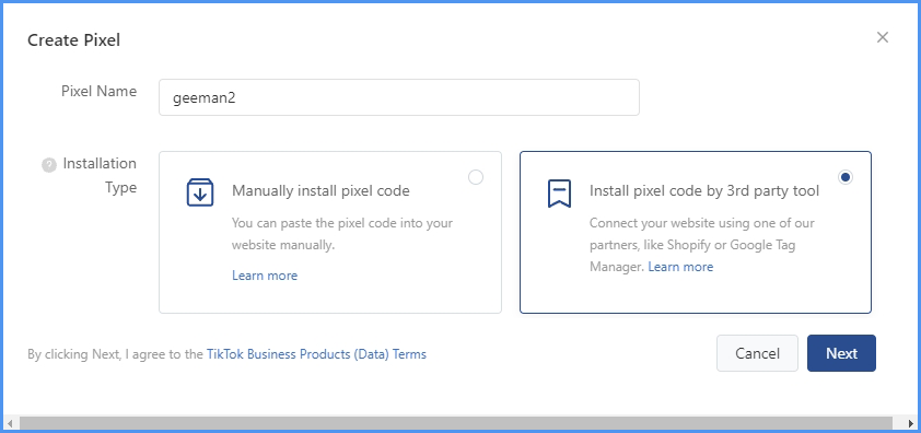 - TikTok partners gave you the option to create pixel code from a third party including Shopify and Google Tag Manager.