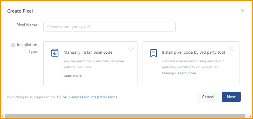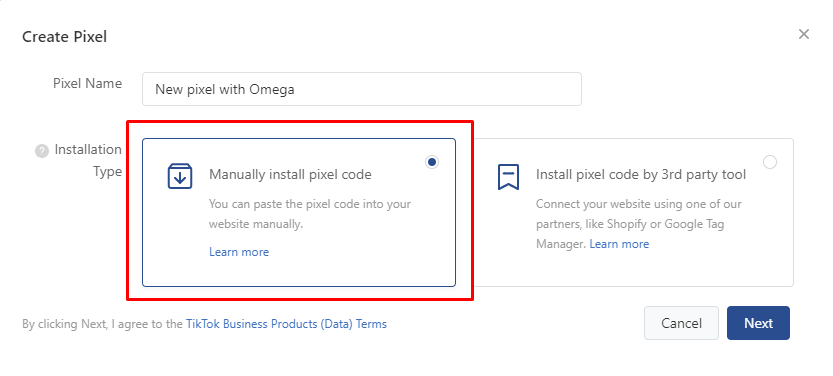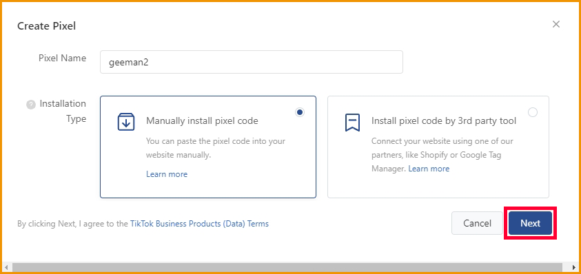 - With the Manually Install Pixel method, After inputting pixel name then click Next