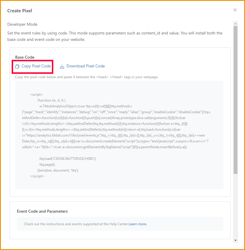 - Copy the Pixel code and keep the page open.