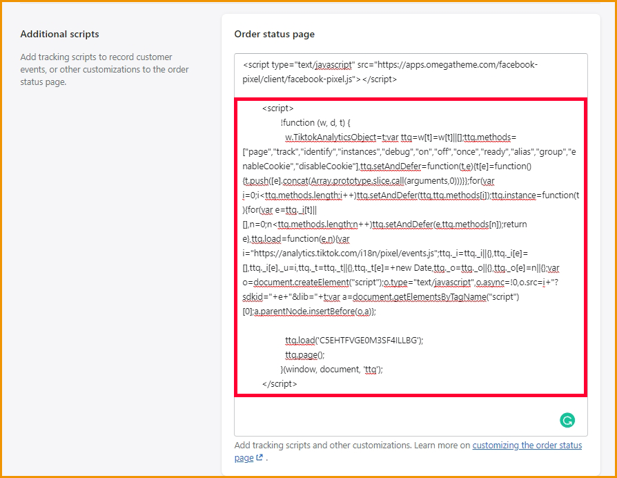 - Then paste again the Tiktok pixel code at the Additional scripts section and click the Save button.