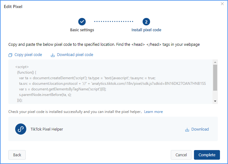 - Next click Complete so you have completed installing Tiktok Pixel code.