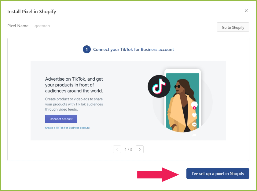 - Then click Go to Shopify button. After finish setup, please come back and select the I have set up a pixel in Shopify