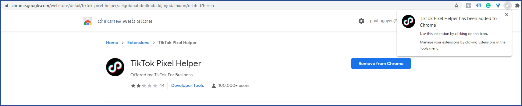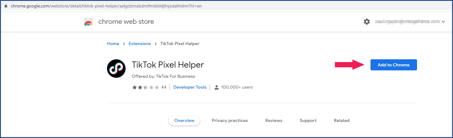 - Choose to Add to Chrome then go to your Shopify store and test on each page by clicking the TikTok Pixel Helper icon.