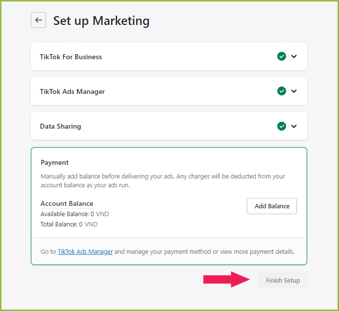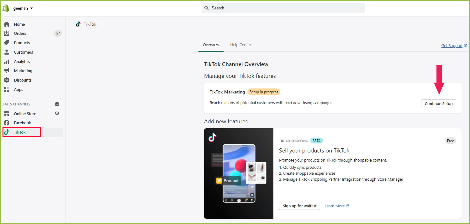 - After Go to Shopify to add the TikTok app to your store, please click Continue Setup in the dashboard
