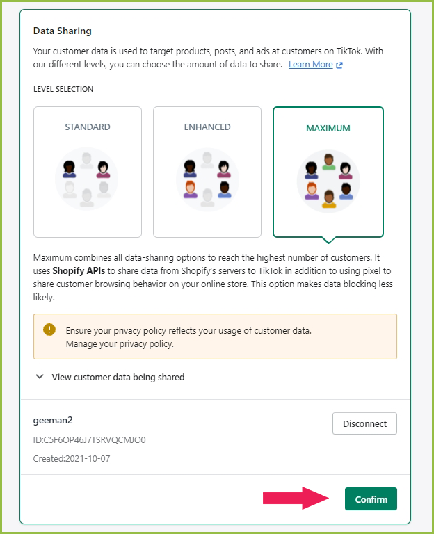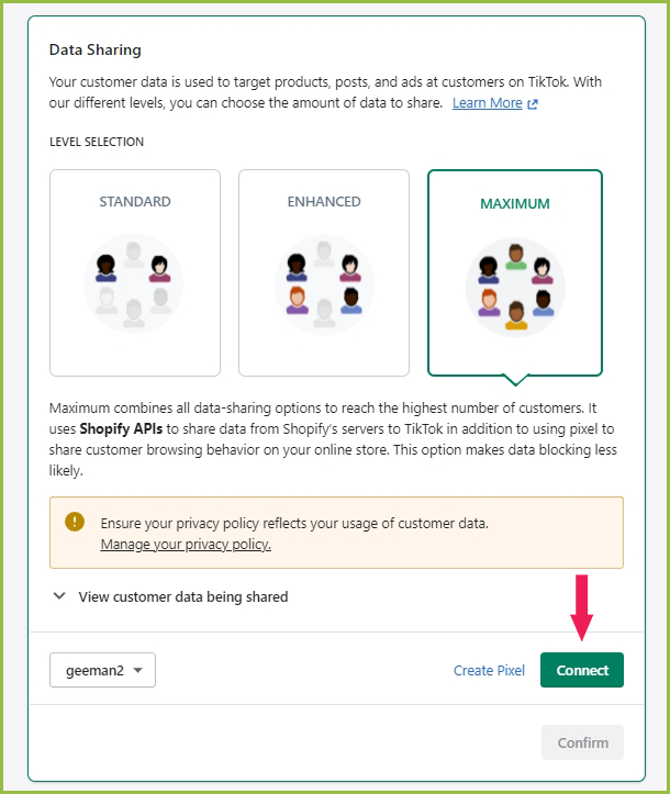 - Turn the Data Sharing option on, then Connect the pixel ID with the app