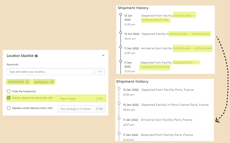 It also replaces any words you don’t want to show on the tracking page with your custom message.