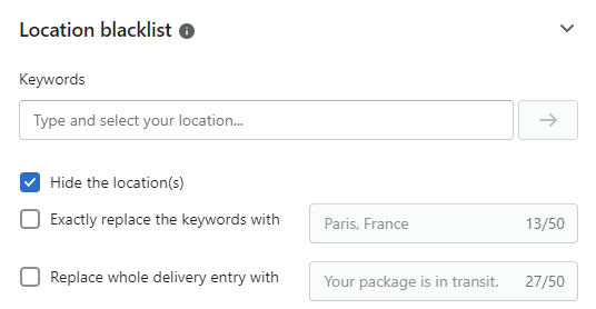 When choosing the “hide the locations” section, it simply conceals a blacklisted word on the tracking page.