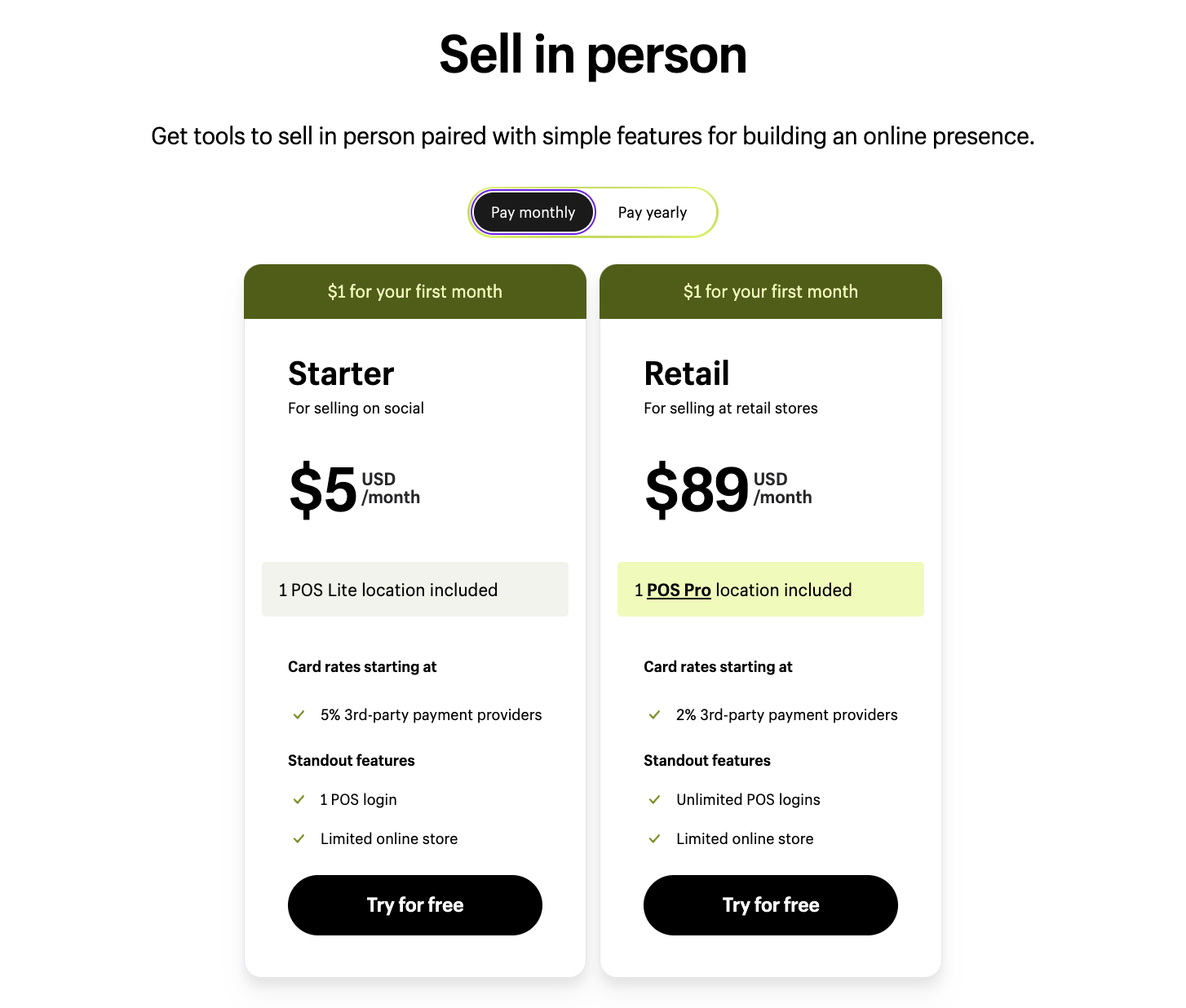 - Shopify Plan: $65 USD/month + $89 USD/month per POS Pro location.