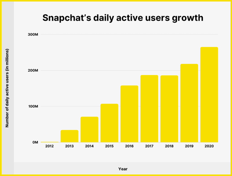 First of all, you can see the number of users of Snapchat is very impressive with more than 293 million active users, and it is increasing annually with 2 digits rate (20% year on year). And those people do not just open the app for checking newsfeed or surfing interesting content. Actually, the average user spends about 30 minutes per day contacting and communicating with their friends visually through Snapchat.