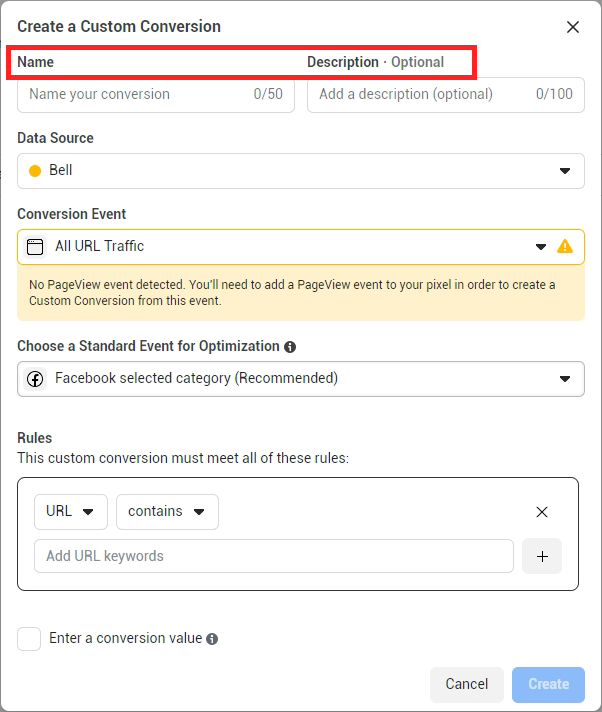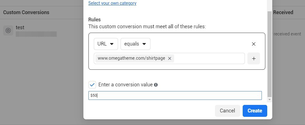 You can add a URL or part of the URL representing your custom conversion (ex: URL contains /thankyou.php for a thank-you page after purchase). This would be equivalent to using the Make purchase standard event. If you’re using URL Equals, make sure you include the domain (for example www.omegatheme.com/shirtpage) too. Don’t need to include “HTTP” or “https”. - Add a conversion value if applicable (ex: If you’re selling shirts worth $50, put $50 into the Conversion value field). Including a conversion value allows you to view your return on ad spend in your report.