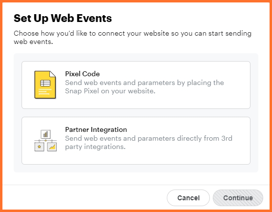 Then select the Setup Snap Pixel option, the pop-up will appear. It allows you to select the method to connect Snap pixel with your website through pixel code (manual setup) and Partner Integration.