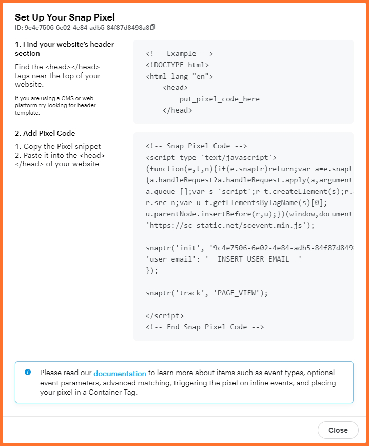 As you select “Continue”, the pixel popup will appear. Copy pixel ID and the Pixel snippet code for the later setup.