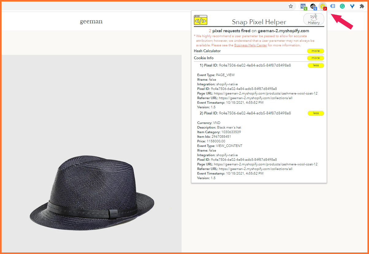 The Snap Pixel Helper displays the two requests from the pixel fired on the test store, you can check the pixel ID and the item IDs as well. So after checking all the event triggers, you will be able to approach the huge customer pool with young generations like Z or Millennials. With the right marketing strategy and well-executed ads, Snapchat can be an effective way to market your Shopify dropshipping business.