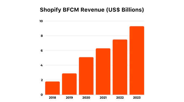 In 2023, Shopify merchants achieved a record-breaking $9.3 billion in sales during BFCM, marking a 24% growth compared to the previous year.