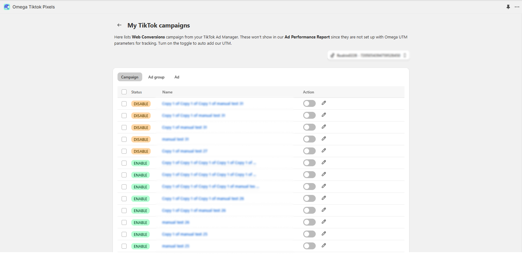Merchants who opt for manual campaigns still benefit from Omega’s automation. When setting up your ad, simply turn on the UTM tracking toggle in the app, once enabled, UTM parameters are automatically embedded into your TikTok ad URLs.